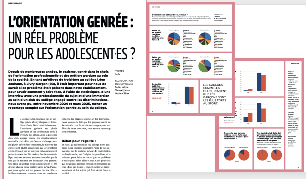 La classe de 3ᵉ5 s’est engagée dans la conception d’une publication collective visant à déconstruire les clichés et les normes de genre. Les élèves se sont approprié l’ensemble des étapes de fabrication d’une revue — réflexion éditoriale, écriture des articles, choix iconographiques et travail de maquette — donnant naissance à un numéro intitulé La Déferlante, grandir : entre pression et affirmation.